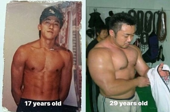 사진에는 마동석의 4살 때부터 지금까지의 다양한 변천사가 담겼다. 4살과 5살 때 귀여운 모습의 어린이 마동석은 이후 17살 시절에는 슬림한 근육질 몸매를 과시하고 있다.