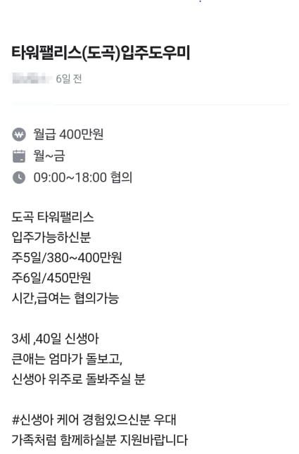 서울 강남구 도곡동 타워팰리스 입주 도우미를 구하는 구인 공고가 온라인상에서 화제를 모으고 있다. 급여에 대한 네티즌들 의견도 갈리고 있다.2024년 4월 18일 중고 거래 앱 당근마켓에는 ‘도곡 타워팰리스 입주 도우미’라는 구인 모집 글이 올라왔다. 공고문에 따르면 월~금요일 오전 9시부터 오후 6시까지 일할 경우 월급이 380만~400만원이다. 토요일까지 주 6일 일할 경우에는 한 달에 450만원을 받을 수 있다. (adsbygoogle = window.adsbygoogle || []).push({});" data-ke-type="html">HTML 삽입미리보기할 수 없는 소스 작성자 A씨는 “도곡 타워팰리스 입주 가능하신 분을 찾는다”며 “3세와 40일 신생아가 있는..