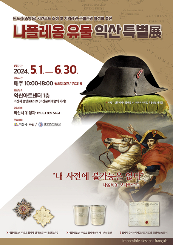 전북자치도 익산시는 문화예술의 거리 익산아트센터에서 오는 5월 1일부터 6월 30일까지 2개월간 '나폴레옹 유물 익산 특별전(展)'을 개최한다. 나폴레옹 유물은 김홍국 하림그룹 회장의 소장품으로 고향인 익산시 요청에 따라 흔쾌히 수락해 전시회가 마련됐다.