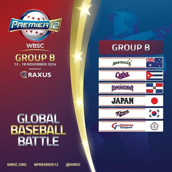 프리미어 12, 조 추첨 결과 대한민국 B조 류중일 감독이 이끄는 한국야구대표팀이 2024 세계야구소프트볼연맹(WBSC) 프리미어12에서 일본, 대만, 쿠바 등과 한 조에서 경쟁한다. 2023년 12월 기준 세계랭킹 상위 12개 팀이 참가하는 이번 대회를 앞두고 WBSC가 18일 공개한 조 추첨 결과 랭킹 4위 한국은 일본(1위), 대만(5위), 쿠바(8위), 도미니카공화국(9위), 호주(11위) 등과 함께 B조에 이름을 올렸다. 카테고리 없음 2024.04.19